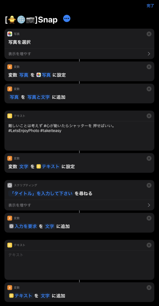 では上記で説明したスナップ投稿のショートカットの作り方を解説していこう。